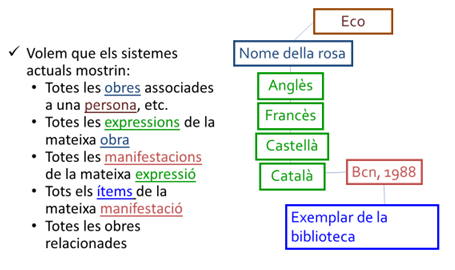 - Donar consistència a les dades dels catàlegs en funció de la distinció entre el contingut intel·lectual dels recursos i la seva manifestació física.