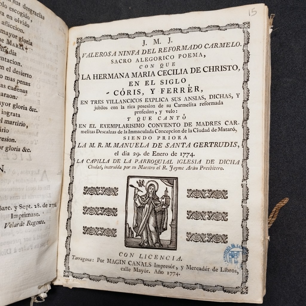 Destaquem l’aparició d’una dona autora d’uns villancets, la religiosa carmelitana María Cecilia de Cristo (al segle, Coris y Ferrer), que podrem afegir al recurs Dones al Fons Antic UB. També enriquirà la col·lecció Llibrets de música, en què la nostra biblioteca actualment s’està concentrant, dins del context del Grup per a l’Estudi del Patrimoni Musical de la UB (GEPAM), que té com a objectiu difondre el ric fons musical del CRAI Biblioteca de Fons Antic.