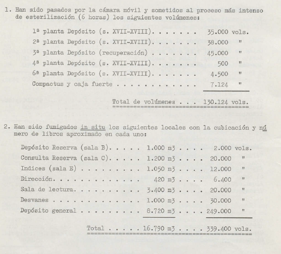 De l’1 de març fins al 2 de maig de 1970, es netegen uns 130.000 volums, els més valuosos, s’ubiquen en una cambra mòbil de desinfecció amb gasos compostos de carbonats de clor i s’esterilitza i es fumiga tota la Biblioteca.