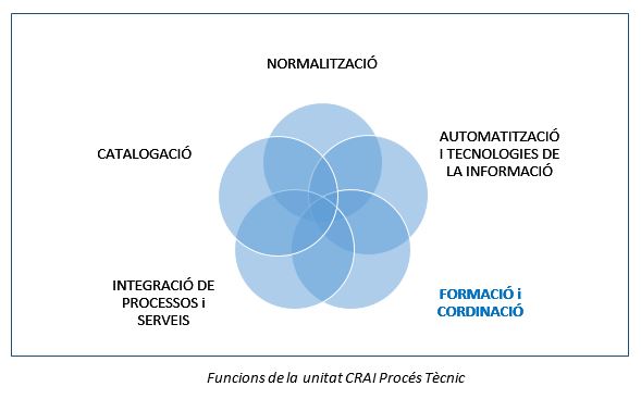 Una part del personal de la Unitat de Procés Tècnic del CRAI porta més d’una dècada formant de manera continuada a catalogadors, tant en qualitat de professors associats de la Facultat de Biblioteconomia i Documentació, com en qualitat de professors de formació continuada, per encàrrec de diferents institucions com són el Col·legi de Bibliotecaris-Documentalistes de Catalunya, el Consorci de Serveis Universitaris de Catalunya, la Biblioteca de Catalunya i els Serveis Tècnics de nombroses universitat catalanes i d’altres comunitats.