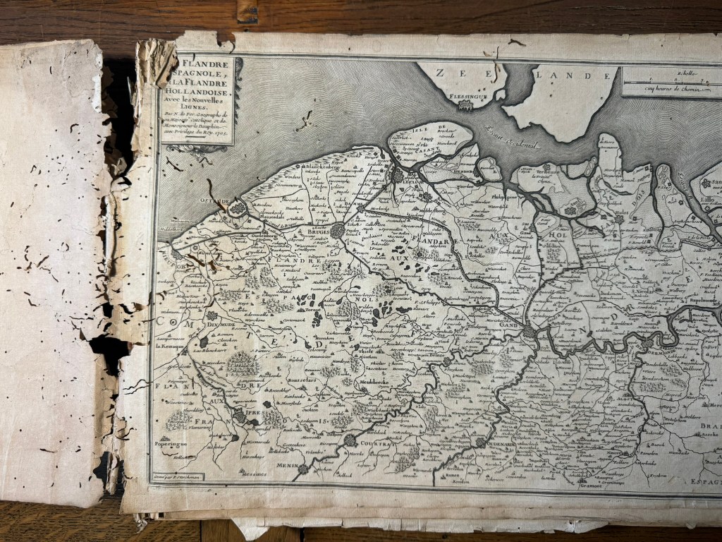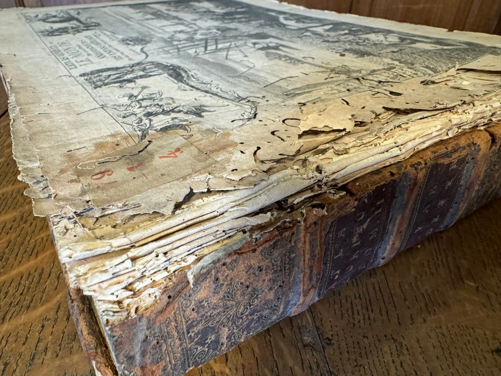 Impresa a Anvers l’any 1583 per Christophe Plantin, un dels impressors més importants del Renaixement europeu, es tracta d’una edició majestuosa, profusament il·lustrada amb gravats, entre els quals destaquen escenes bíbliques i grans estampes plegades amb mapes del món i de Terra Santa, així com una vista i un plànol del Temple de Jerusalem. A més, inclou interessants senyals manuscrits per a l’ús litúrgic —com lletres marginals, indicacions de lectura o signes en vermell— que probablement daten del segle XVII i revelen l’ús actiu que en feien els monjos de la Cartoixa de Santa Maria de Montalegre.